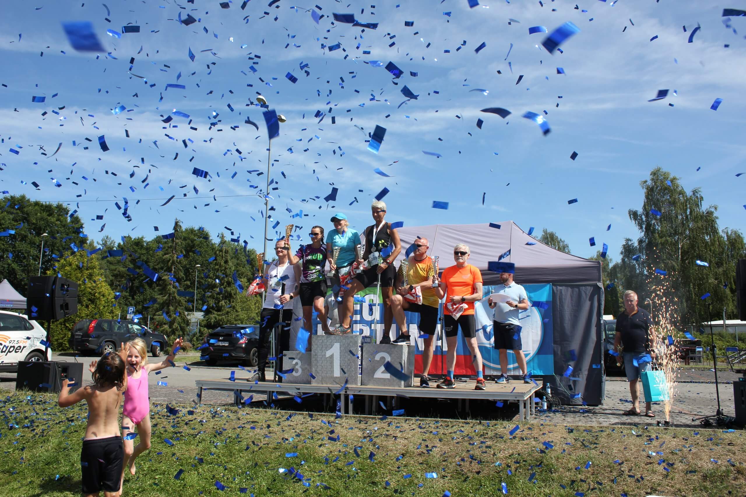 zwycięzcy biegu - seniorzy na podium, wokoł przemieszcza się konfetti