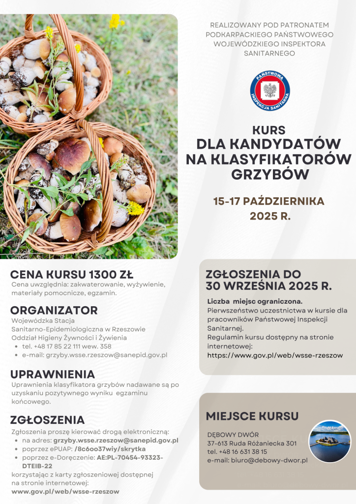 Podkarpacki Państwowy Wojewódzki Inspektor Sanitarny informuje, że w dniach 15–17 października 2025 r. odbędzie się kurs dla kandydatów na klasyfikatorów grzybów. Kurs zostanie przeprowadzony w Dębowym Dworze, ul. Ruda Różaniecka 301, 37-613 Ruda Różaniecka. Koszt uczestnictwa wynosi 1300 zł i obejmuje zakwaterowanie, wyżywienie, materiały pomocnicze oraz egzamin końcowy. Po uzyskaniu pozytywnego wyniku egzaminu uczestnik nabywa uprawnienia klasyfikatora grzybów.