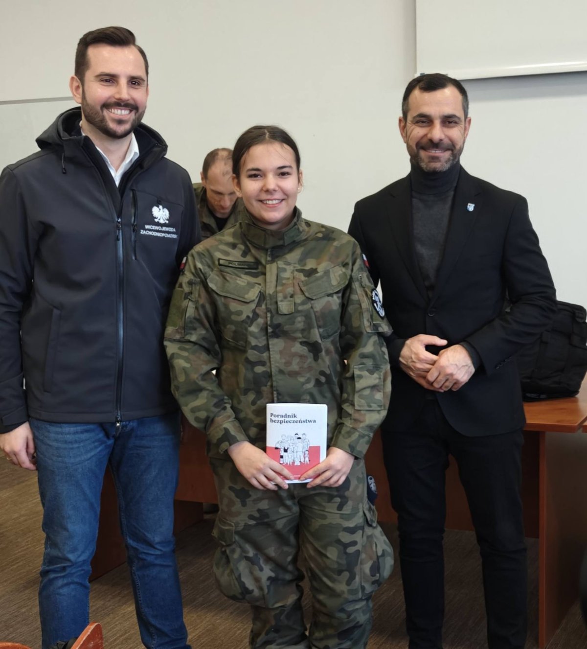 Podczas rozmowy z młodzieżą omówione zostały również praktyczne wskazówki dotyczące bezpieczeństwa, w tym zasady przygotowania plecaka ewakuacyjnego. Na zakończenie uczniowie otrzymali poradnik bezpieczeństwa, który z pewnością okaże się wartościową lekturą.