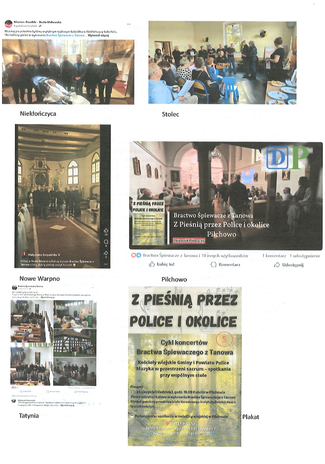 W 2025 roku Bractwo Śpiewacze z Tanowa wyruszyło w trasę po miejscowościach Powiatu Polickiego, by śpiewem łączyć ludzi. Odwiedziliśmy wiejskie kościoły i świetlice - miejsca codzienne, bliskie mieszkańcom. Wykonywaliśmy pieśni sakralne i ludowe - te, które pamiętają nasi dziadkowie, i te, których uczy się młodsze pokolenie. Wystąpiliśmy w kościołach wiejskich oraz świetlicach środowiskowych m.in. w Tanowie, Tatyni, Niekłończycy, Stolcu, Nowym Warpnie na terenie powiatu