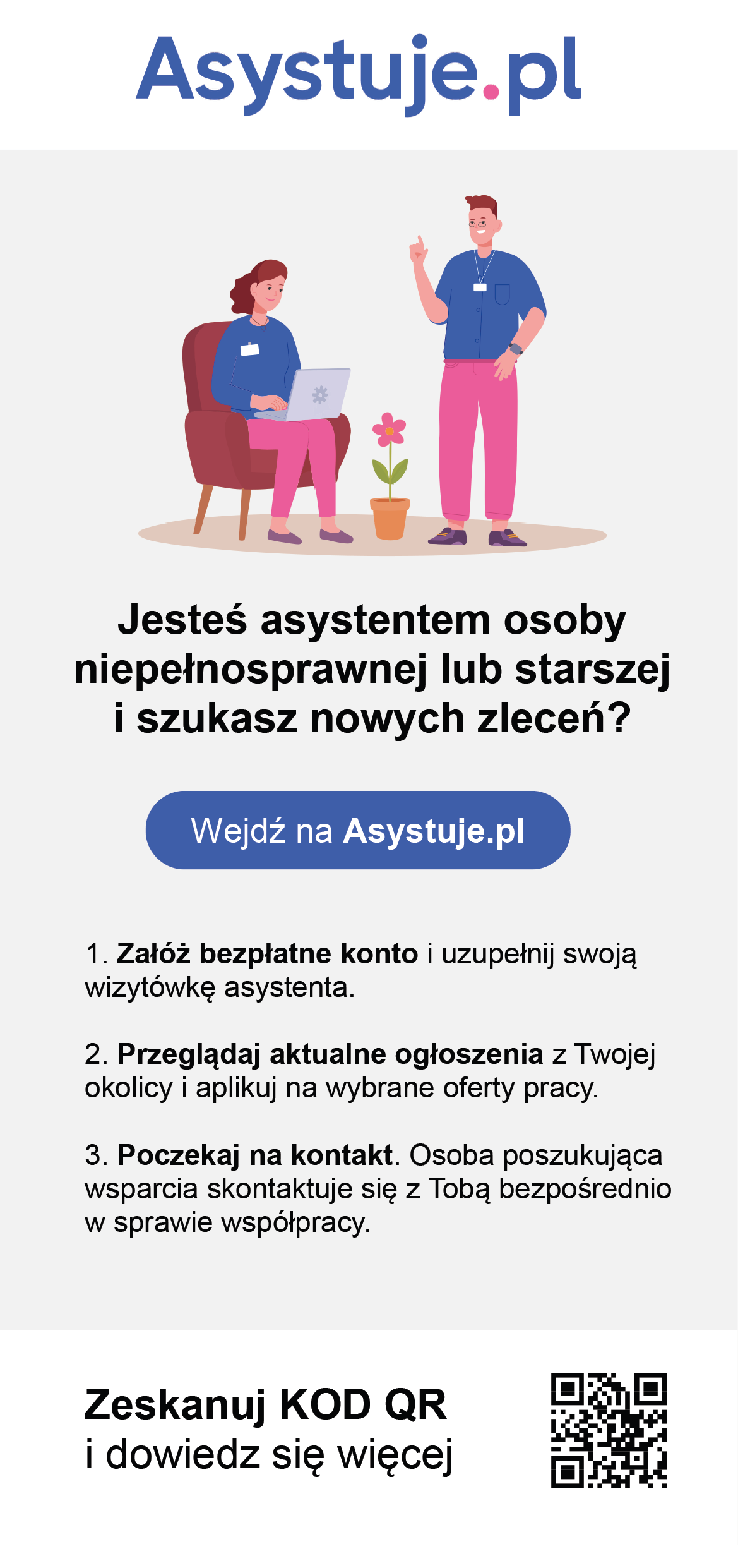 Jesteś asystentem osobistym? Osoby świadczące usługi asystenckie mogą bezpłatnie utworzyć profil i zamieścić informację o swojej ofercie, aby umożliwić bezpośredni kontakt osobom poszukującym wsparcia.