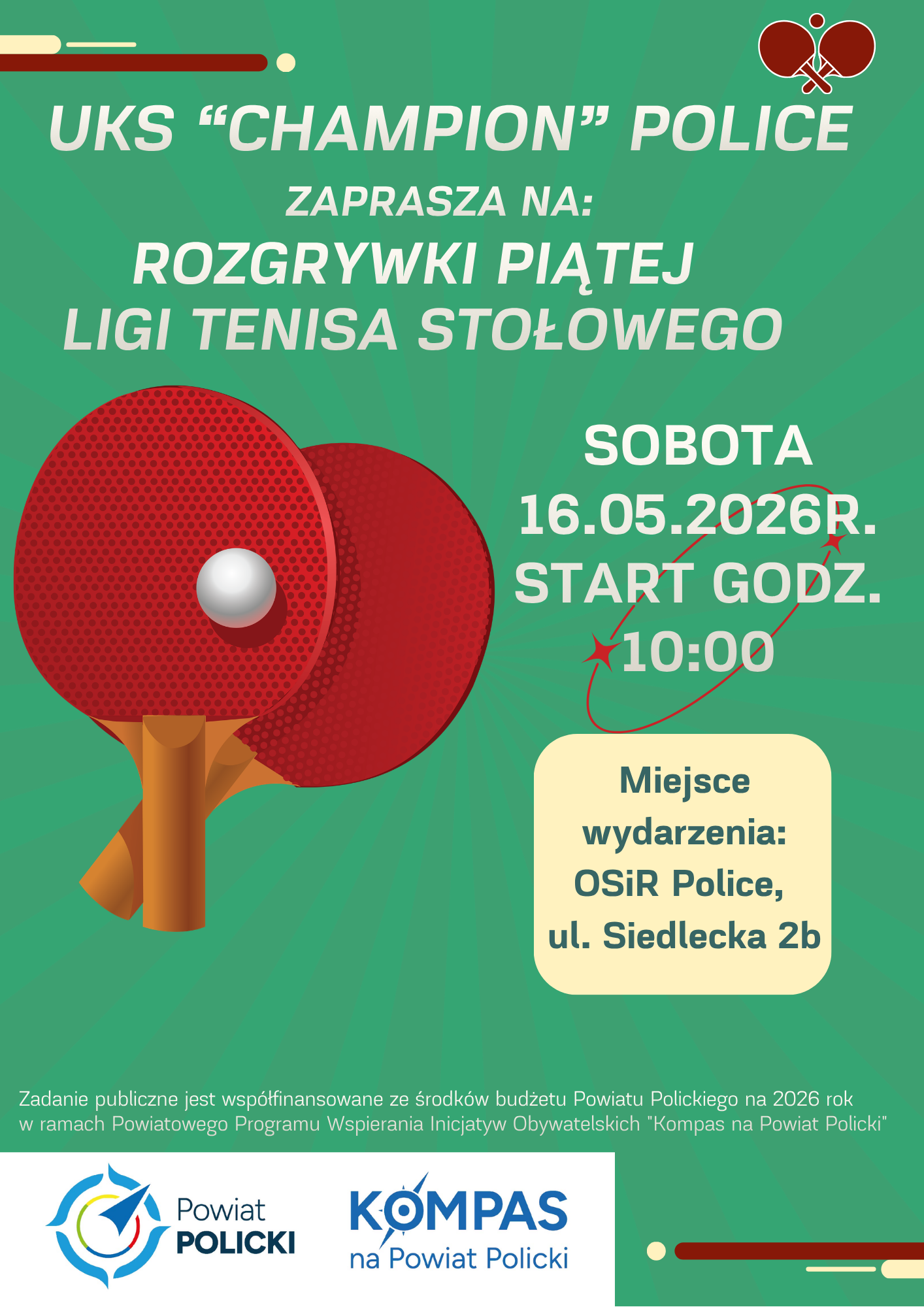 16-05-2026 10:00 - 16-05-2026 15:00 OSiR, ul. Siedlecka 2b, Police Rozgrywki Piątej Ligi Tenisa Stołowego