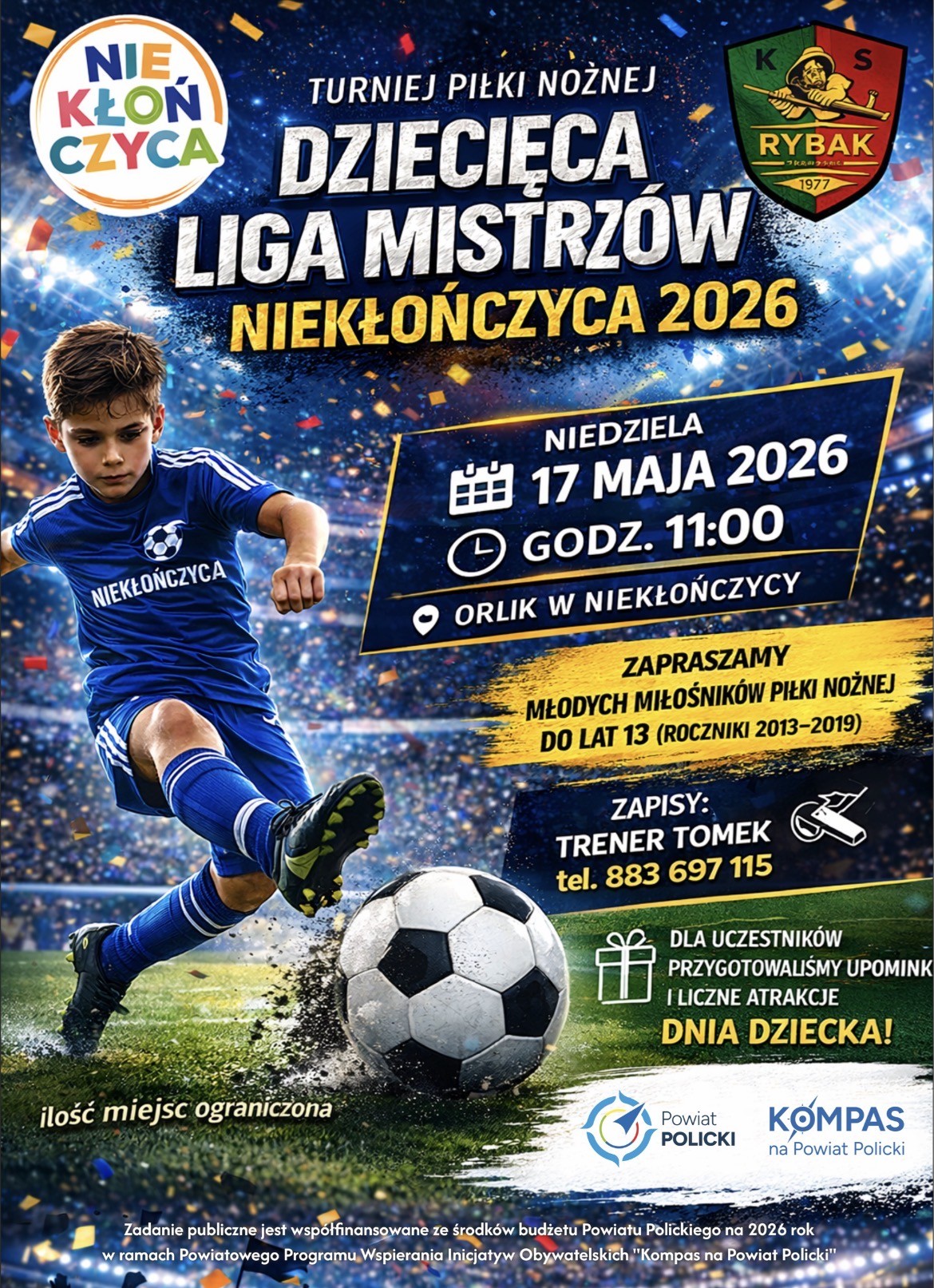 17-05-2026 11:00 - 17-05-2026 15:00 Orlik w Niekłończycy Turniej piłki nożnej Dziecięca Liga Mistrzów - Niekłończyca 2026