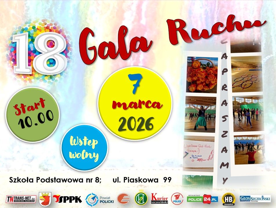 Już w sobotę, 7 marca 2026 r., w Szkole Podstawowej nr 8 im. Jana Pawła II w Policach odbędzie się XVIII edycja Polickiej Gali Ruchu – wydarzenia promującego aktywny i zdrowy styl życia. Gala rozpocznie się o godz. 10.00 i potrwa do około 15.00.